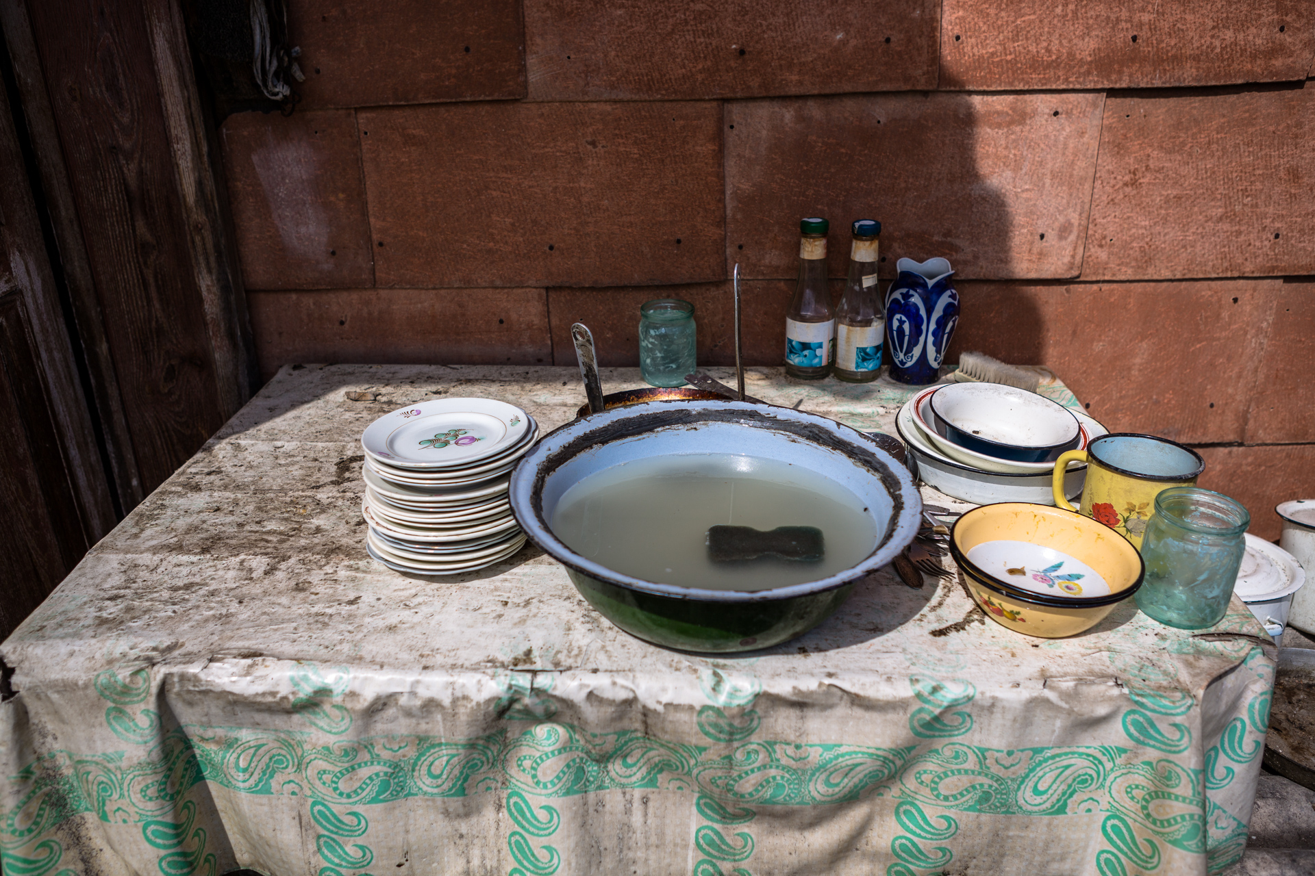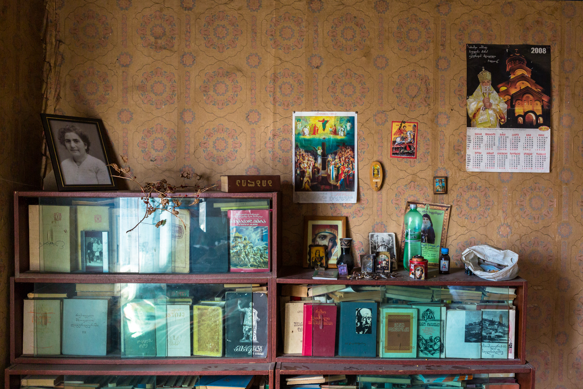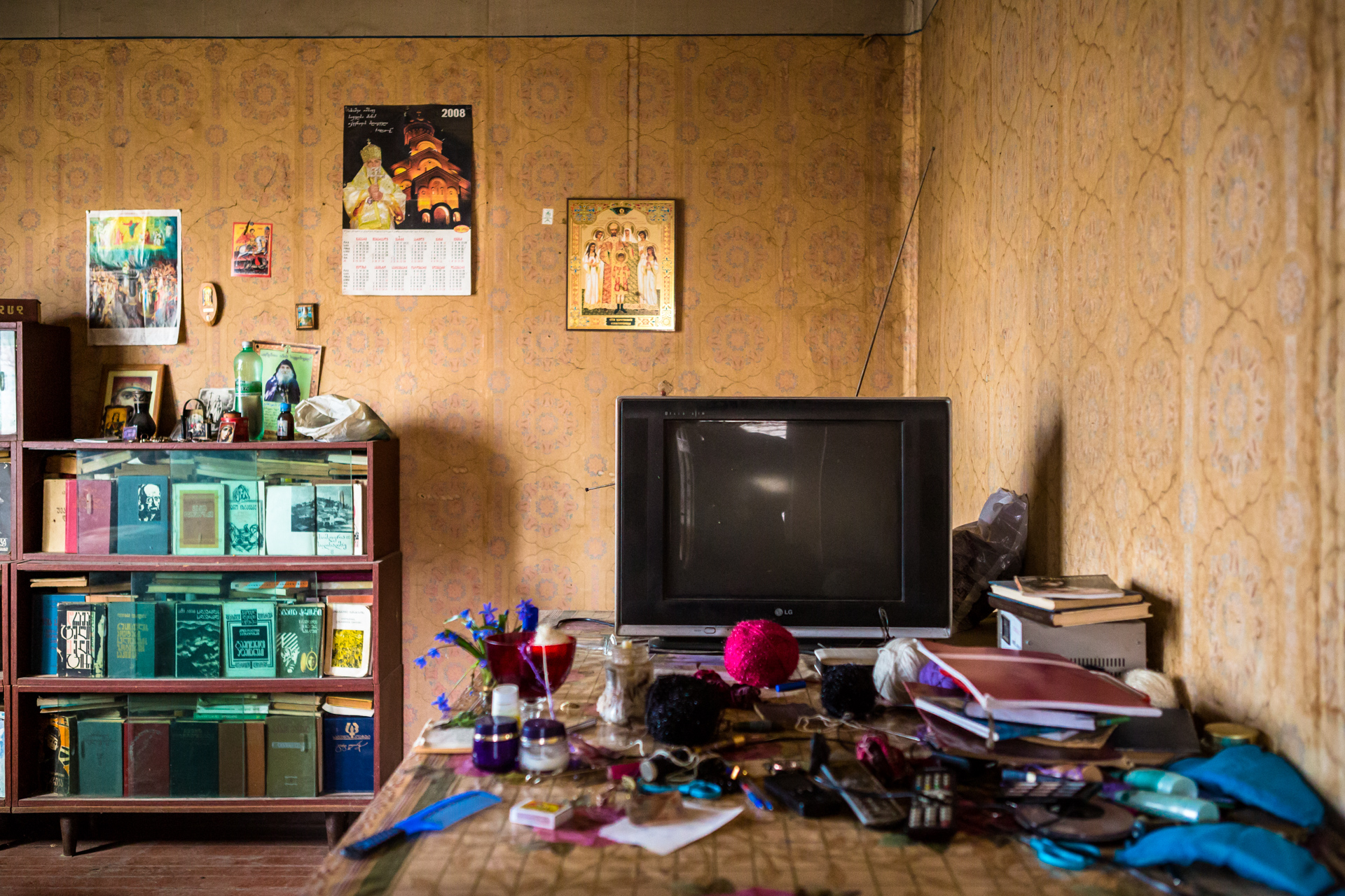 Im Haus ist es dunkel und stickig. Der Vater sitzt hustend neben dem Holzofen. Überall stapelt sich Zeitungspapier. Der Kalender an der Wand ist eine Dekade alt. 2008 – Kaukasuskrieg. Ob das damit zusammenhängt? Ich frage nicht nach. Das Bild der verstorbenen Mutter steht andächtig auf dem Bücherregal. Daneben eine verdorrte Zimmerpflanze. Alles wirkt, als wäre die Zeit stehen geblieben. Der Rundgang durch das kleine Haus ist schnell gemacht und stimmt nachdenklich.
